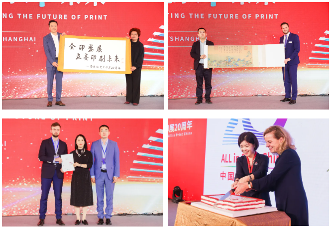 上海市印刷行业协会会长沈剑毅,联强集团理事长、上海众鹤国际贸易有限公司董事长黄伟,中华商务联合印刷(香港)有限公司副总经理、北京华联印刷有限公司总经理朱敏代表行业同仁分别发表致辞对全印展给予了美好祝福,并向与会嘉宾分享了二十年来与全印展之间的美好回忆。