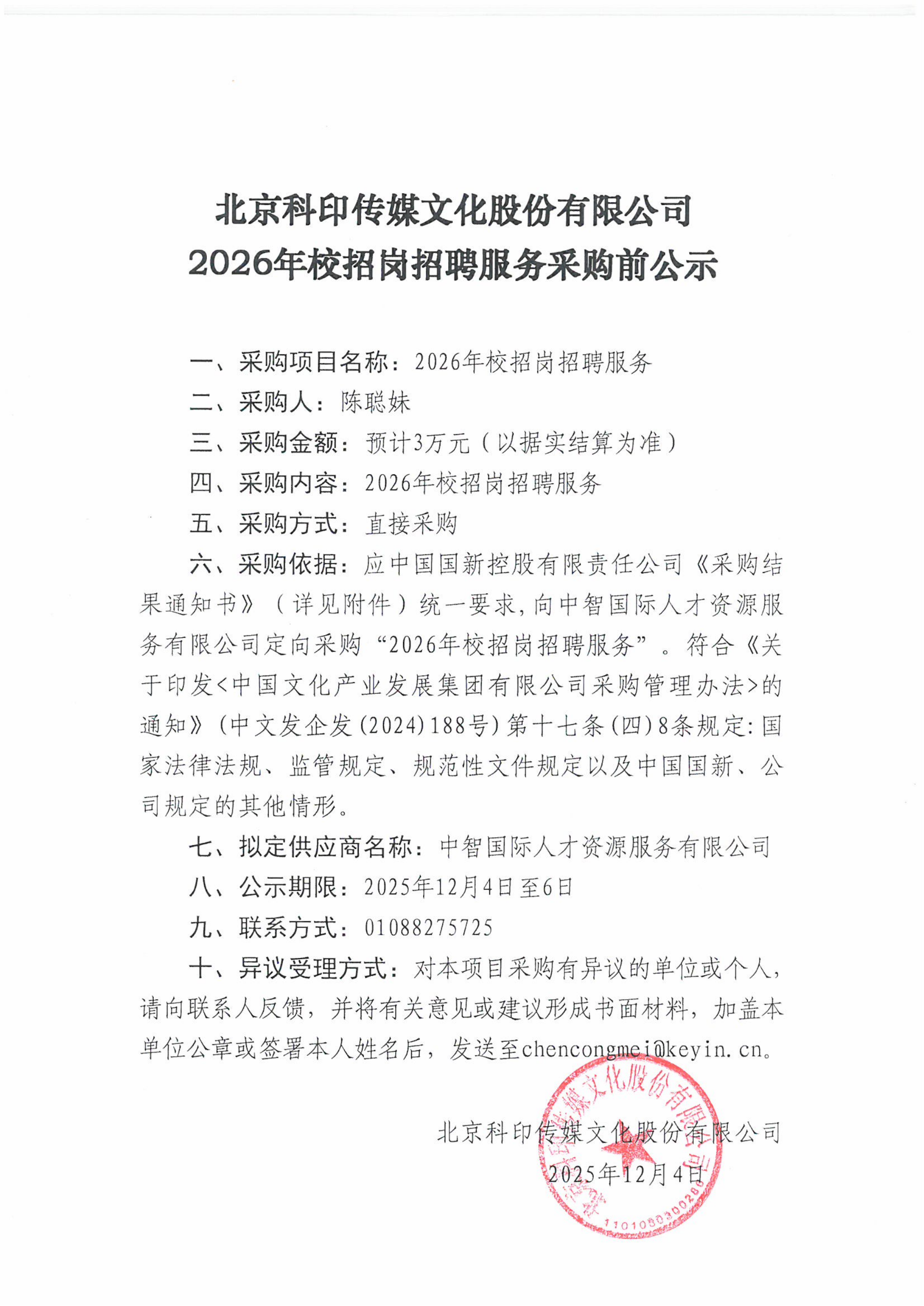 科印传媒2026年校招岗招聘服务采购前公示