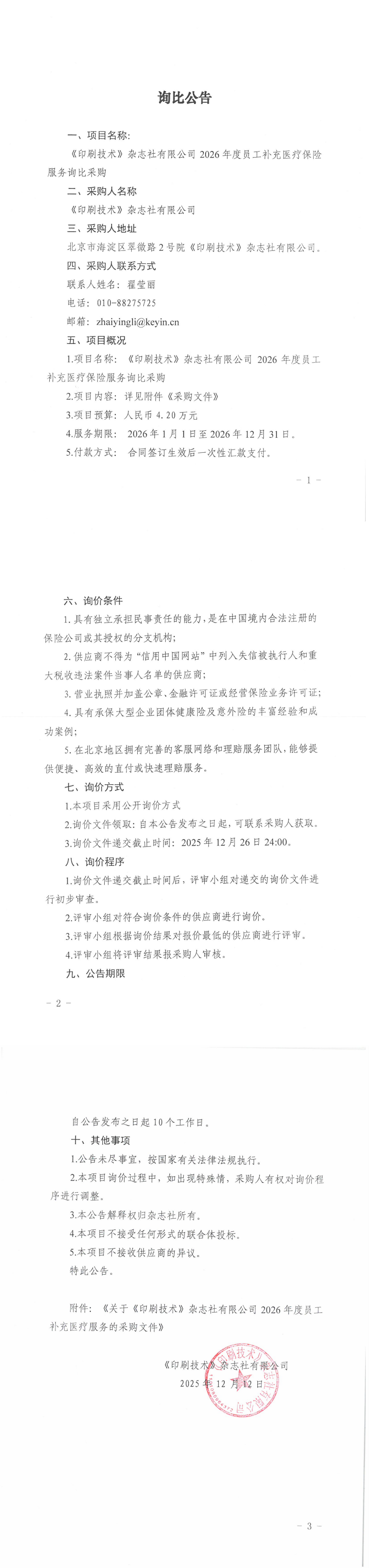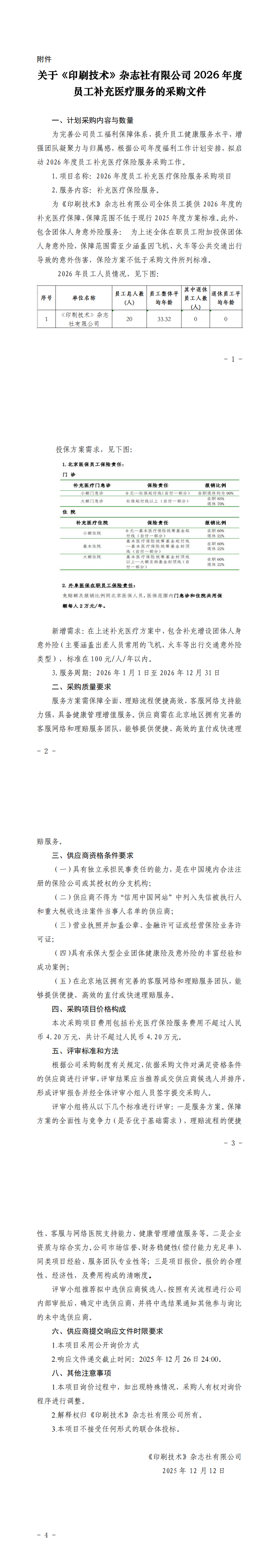 《印刷技术》杂志社有限公司 2026年度员工补充医疗保险 服务询比采购